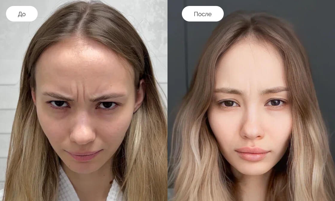 Алена обратилась к нам, чтобы убрать мимические морщины в области межбровья и лба.